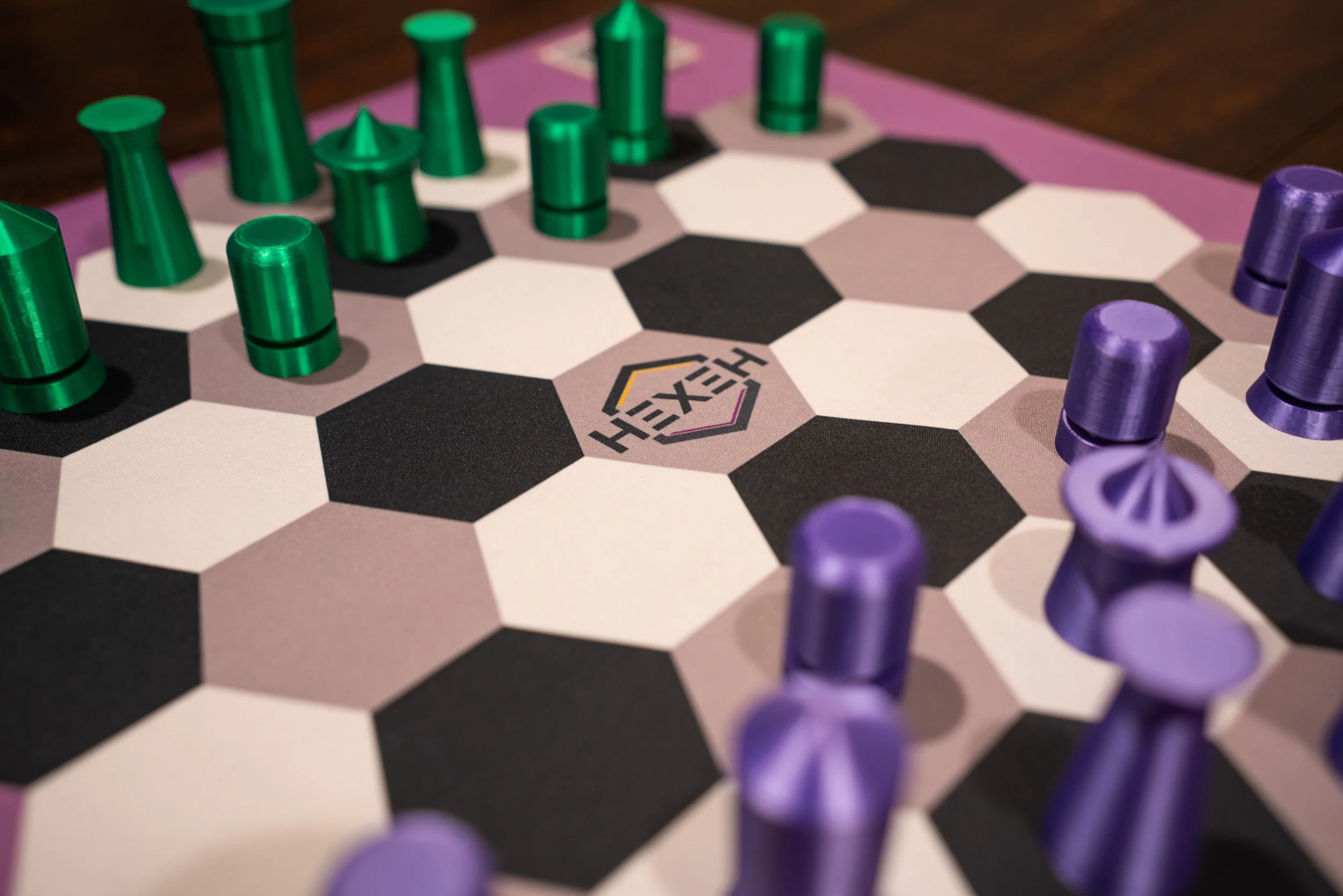 Position the Hexeh board so that columns of hexagons run between the two players. These columns are called “files”.
